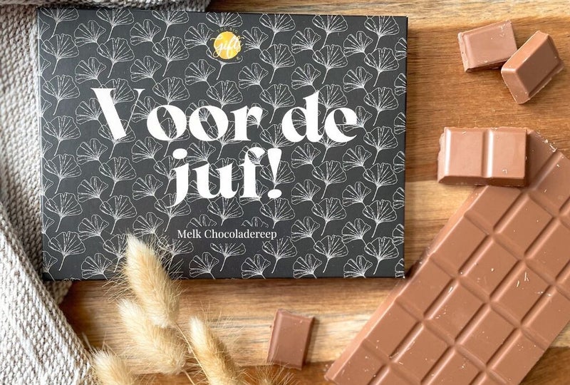 Verras de juf met een heerlijk Chocoladereep gemaakt van 100% Callebaut melkchocolade. De reep is verpakt in een mooie verpakking met de tekst 'Voor de Juf'.