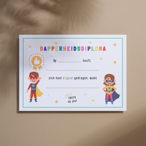 Een dapperheidsdiploma voor alle kindjes die iets dappers hebben gedaan. Of het nu gaat om de eerste schooldag, een spannende sportprestatie, of het overwinnen van een angst, met dit diploma laat je zien dat je trots bent.