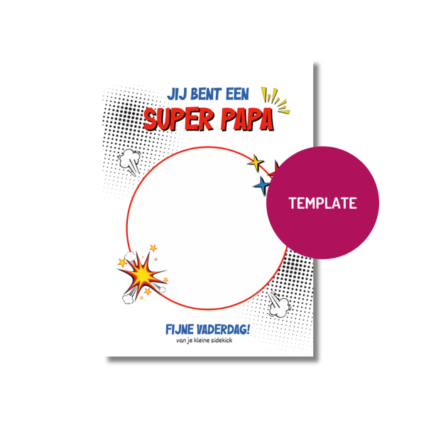 De tekst je bent een super papa staat bovenaan in kleurrijke comic letters. De rest van het ontwerp sluit aan op het superheldenthema, met stoere kleuren en speelse vormen. Print 'm thuis uit op A4-formaat en gebruik verf of stempelinkt voor de handafdruk.