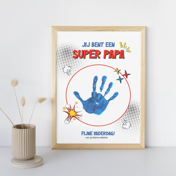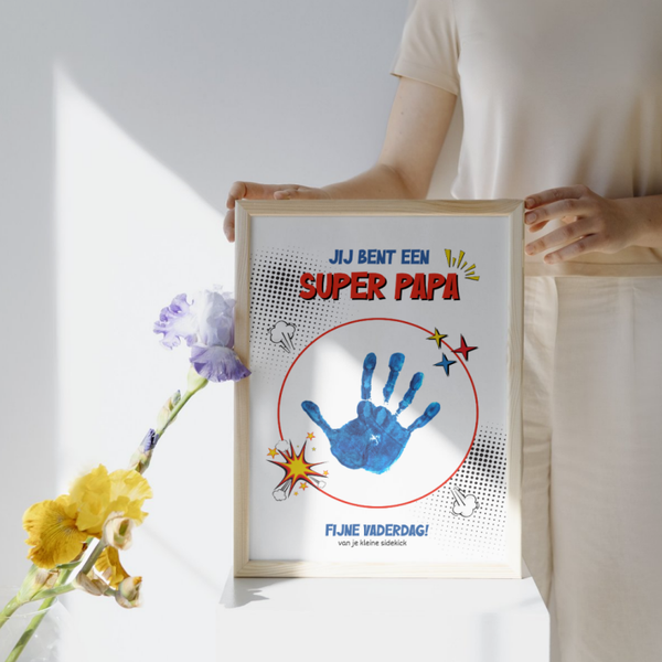 Op zoek naar een origineel en persoonlijk cadeau voor Vaderdag? Deze vrolijke printable in superheldenstijl is perfect voor elke papa! Laat je kind zijn of haar handafdruk zetten op de poster of kaart en maak zo een uniek kunstwerk voor papa.